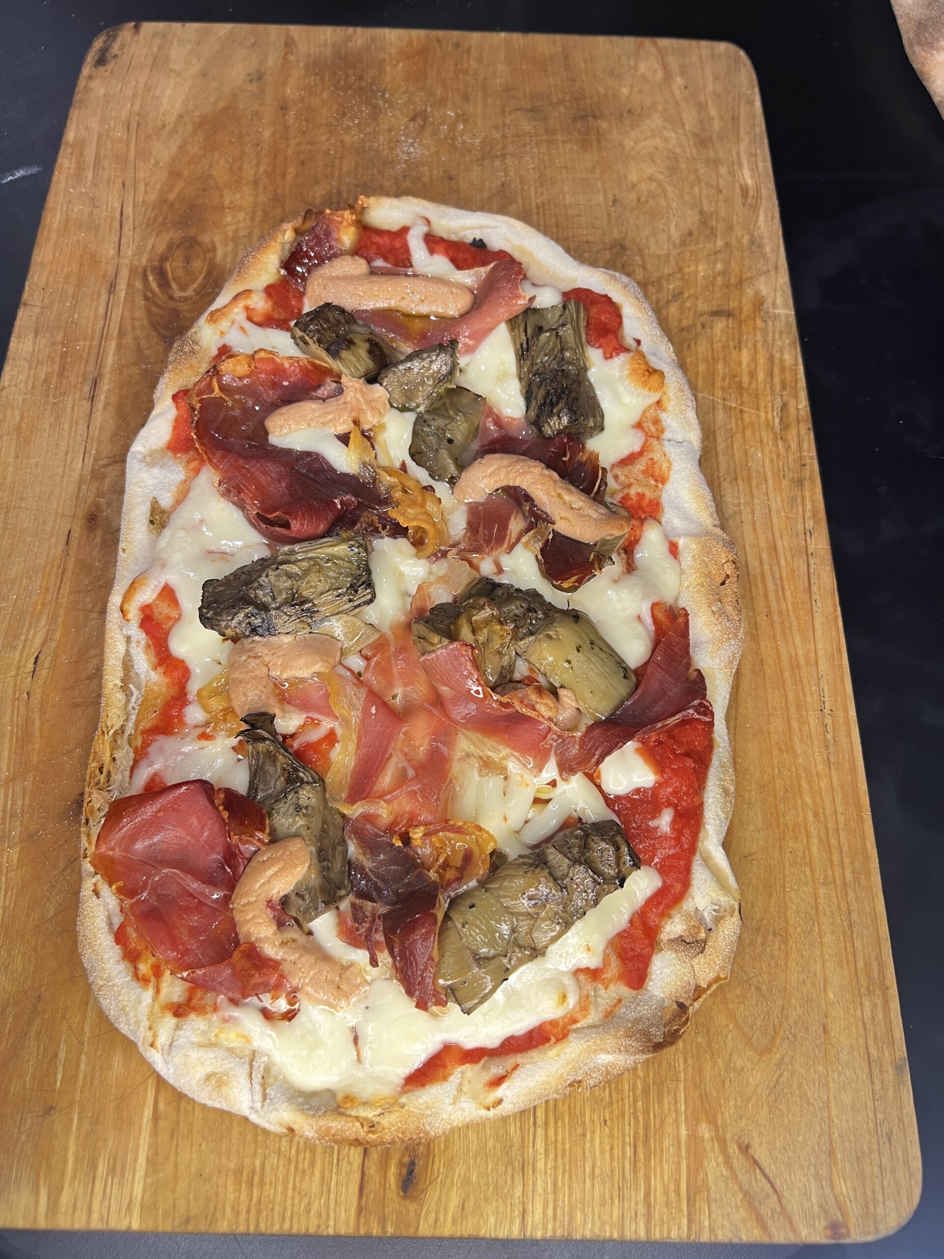 Tomate, mozzarella fior di latte , jamón york, champiñones, aceitunas negras, alcachofas y anchoas